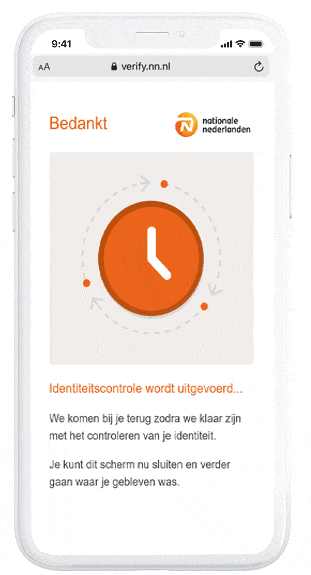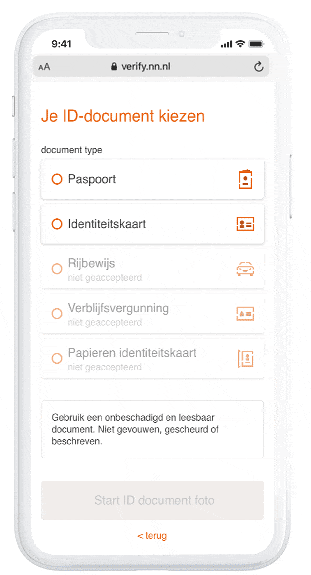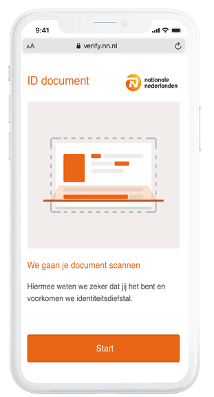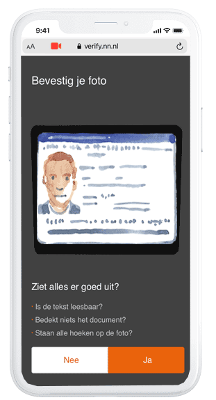 Het online bevestigen van je identiteit doe je in mijn.nn. Ga op je smartphone naar nn.nl en log in op mijn.nn. In mijn.nn zie je direct de melding waarin we vragen de identiteit te bevestigen. Je tikt op de melding en volgt de stappen. Je hebt je paspoort of identiteitskaart nodig. Houd deze dus alvast bij de hand. Bekijk hieronder alle schermen die je doorloopt om je identiteit online te bevestigen.