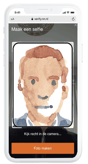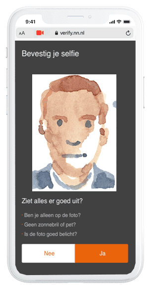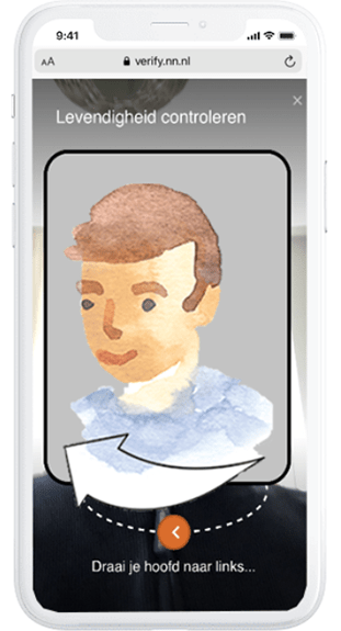 Draai je hoofd lichtjes naar links en rechts wanneer dit gevraagd wordt Let op, je hoeft maar een klein stukje te draaien (niet 90 graden) en kan in de camera blijven kijken. Staat de trilstand van je smartphone aan? Dan trilt de telefoon kort als de draaiing goed is vastgelegd. Deze beweging slaan we op als korte video in onze systemen. Dit vragen we om te controleren dat het echt om jouw gezicht gaat en niet om een foto van een gezicht.