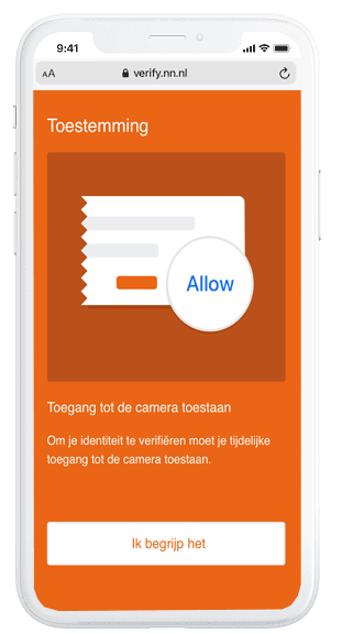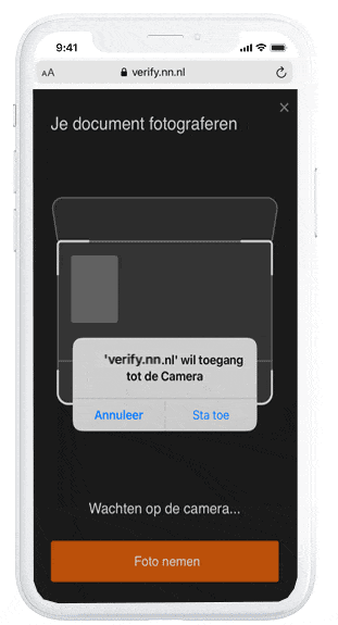 Sta toe dat de website ‘verify.nn.nl’ je camera gebruikt om een foto te maken van je identiteitsbewijs.
