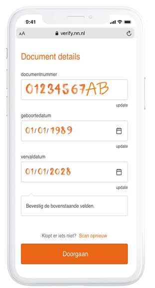 Alle velden staan ingevuld. Controleer de gegevens goed. Is er iets niet ingevuld? Vul het dan zelf in. Klopt er iets niet? Verbeter het dan zelf of druk onderaan op ‘Scan opnieuw’. Klopt alles, dan kun je tikken op ‘Doorgaan’.