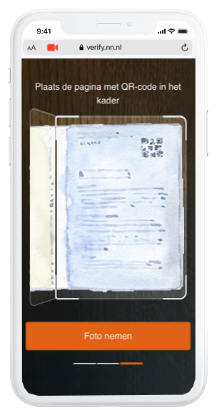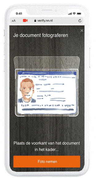 Zorg dat je persoonsgegevens zichtbaar zijn. Leg je opengeklapte paspoort of identiteitskaart plat neer, bijvoorbeeld op tafel. Alles wat op het scherm van je telefoon te zien is, komt op de foto. Dus ook alles buiten het kader. Gebruik daarom bijvoorbeeld een lege tafel als ondergrond. Het maken van deze foto slaan we op als korte video in onze systemen. Zo controleren we de echtheidskenmerken van het document.