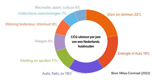Een huishouden stoot ongeveer 19.000 kg CO2 per jaar uit, volgens onafhankelijk kenniscentrum Milieu Centraal. Ruim een kwart van de uitstoot van een gemiddeld huishouden (2,2 personen) komt uit vervoer. Dan gaat het om vliegen en autorijden, maar ook openbaar vervoer en de fiets. Naast vervoer is je huis een van de grootste CO2-bronnen. Tel je je woning (bouwmaterialen, interieur) en je energieverbruik op? Dan is je huis namelijk óók goed voor ruim een kwart van je CO2-uitstoot.