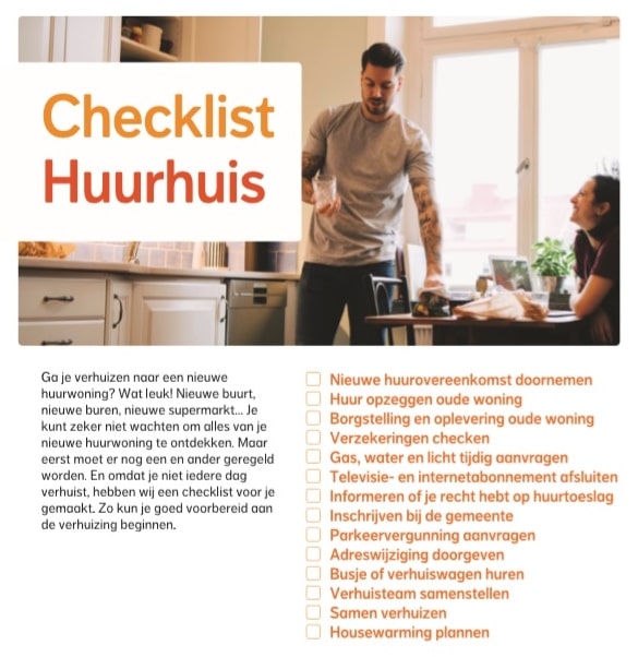 Bij een verhuizing komt heel wat kijken. Met een goede voorbereiding kom je een heel eind. Onze ‘Checklist verhuizen’ helpt je met alle belangrijke zaken waar je aan moet denken. Op die manier kun je de verhuizing soepel laten verlopen.