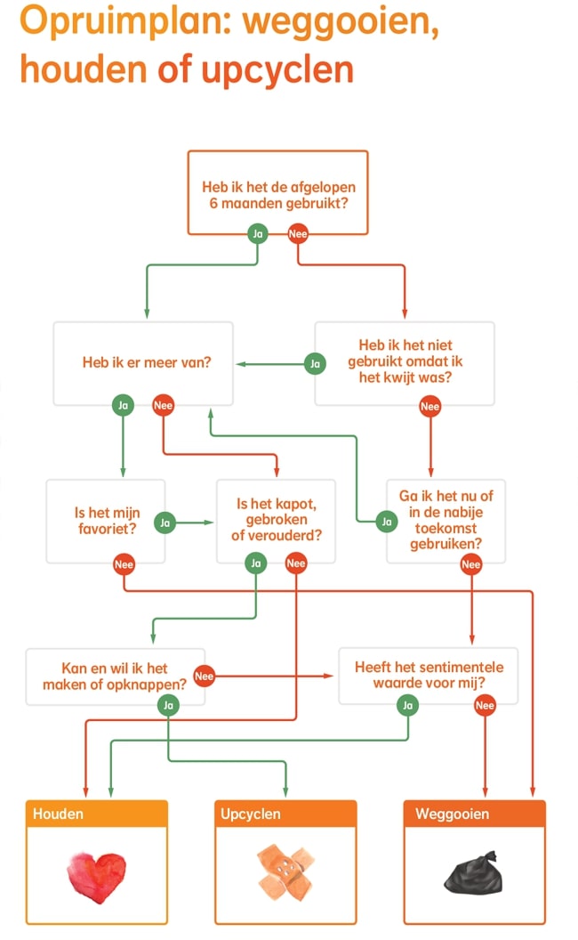 We hebben nog een laatste manier om je te helpen met het opruimen van je woning: ons stappenplan! Handig wanneer je twijfelt om iets weg te gooien. Volg de stappen uit het stappenplan en je krijgt het antwoord op de vraag: gooi je het weg of bewaar je het?