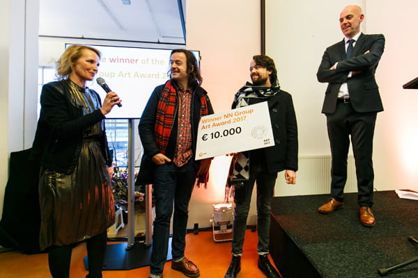 Florian en Michael Quistrebert ontvingen op 8 februari 2017 de award en cheque uit handen van Fleur Hudig, Head of Corporate Citizenship bij NN Group (links) en Fons Hof, Directeur van de Art Rotterdam (rechts).