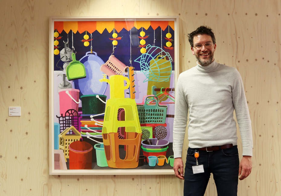 Paul Schuiling: “Een van mijn favoriete kunstwerken is dit werk van Erik Mattijsen, winnaar van de NN Art Award 2021. Erik gaat de hele wereld over en maakt dagelijks foto’s van alledaagse scenes. De inspiratie voor dit werk komt uit zijn tijd in India. Hij was daar erg geïntrigeerd door de vele marktkramen. Deze kramen worden elke dag afgebouwd en de volgende dag op precies dezelfde manier weer opgebouwd. Van de vele foto’s en notities die hij hiervan heeft gemaakt heeft hij dit kleurrijke kunstwerk gemaakt.”