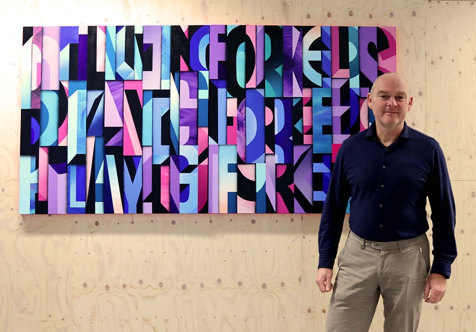 Peter Jansen: “Ik heb dit werk gekozen, omdat er een relatie bestaat tussen dit kunstwerk en een aantal muren hier op kantoor. Het werk van Said Kinos gaat over communicatie en thema’s die voor hem belangrijk zijn. Voor deze werken heeft hij diverse thema’s gekozen die ook voor ons belangrijk zijn, zoals duurzaamheid, diversiteit en inclusiviteit. Deze thema’s zie je op dit kunstwerk - en op onze muren - in woorden terug. Wat ik gaaf vind is dat je ziet dat er iets staat, maar je moet er wel moeite voor doen om het te zien.”