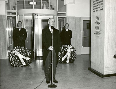 Directeur P. Heering van De Nederlanden van 1845 spreekt bij de gedenkplaat op het hoofdkantoor in Den Haag in 1954.