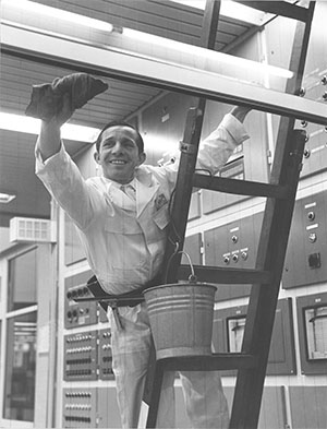 Cas van Os (Rotterdam, 1907-1989) werkte vanaf eind jaren ’40 voor de Nationale. In 1955 wordt hij in het personeelsblad aangekondigd als ‘bekwame fotograaf’. Hij maakt dan een reportage in dierentuin Blijdorp. Er volgen meer reportages voor het blad, zowel buiten als in de kantoren zelf. In de fotocollectie van Nationale-Nederlanden bevinden zich vijftig foto’s van Van Os. Hij fotografeerde de directie, maar ook medewerkers op kantoor. Een van zijn reportages ging over de glazenwassers in het hoofdkantoor in 1960. De laatste foto’s zijn uit het begin van de jaren ’70. Zijn foto’s zijn weliswaar documentair van aard, maar hebben ook een menselijke touch.
