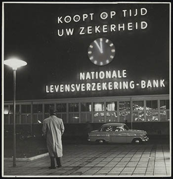 Deze nachtelijke foto stond op de achterpagina van het personeelsblad ‘Het Nationaal Kompas’ in april 1956. We zien een man die een lichtreclame bekijkt van de Nationale Levensverzekering-Bank op de Lijnbaan in Rotterdam. Het is donker en de klok staat op 5 voor 12. De fotograaf is Cas van Os.