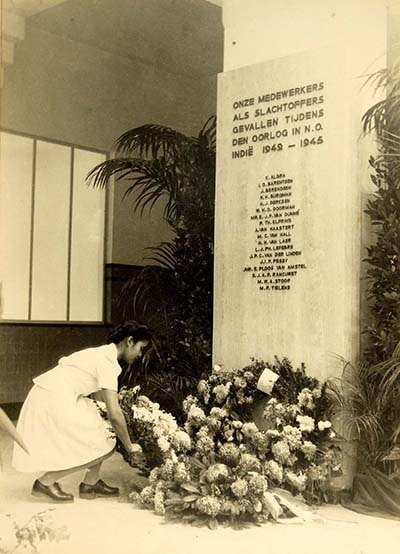 Een medewerker legt bloemen bij de gedenkplaat bij het hoofdkantoor in de Groenhovenstraat in Den Haag in 1946.