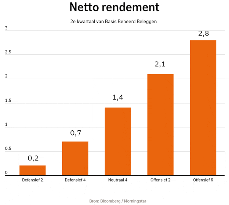 In het tweede kwartaal behaalden alle modelportefeuilles een positief resultaat. Het rendement van modelportefeuille Neutraal 4 kwam het afgelopen kwartaal uit op 1,4%. Deze portefeuille heeft een standaardweging van 50% obligaties en 50% aandelen.