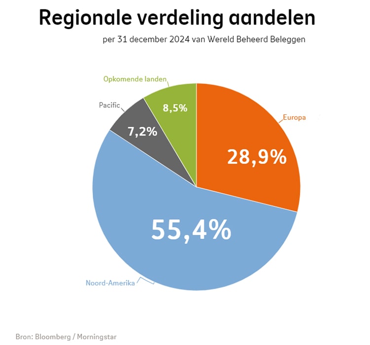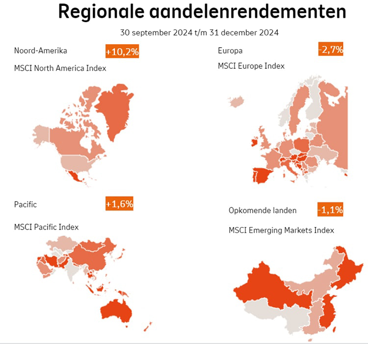 De economie in de Verenigde Staten ontwikkelde zich in het vierde kwartaal beter dan verwacht. Tegelijk kwamen de bedrijfsresultaten over het derde kwartaal hoger uit dan voorspeld. En ondanks dat de inflatie minder snel daalde dan verwacht, zag de Fed toch ruimte om de rente te verlagen. Deze positieve mix van omstandigheden zorgde ervoor dat aandelenbeurzen in de Verenigde Staten sterk stegen in het vierde kwartaal. In veel andere regio’s bleef de stijging beperkt of was er zelfs een negatief resultaat. Zoals in Europa waar de koersen met 2,7% daalden.