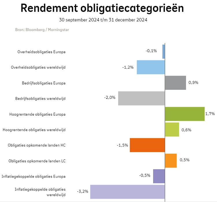 De koersen van Europese bedrijfsobligaties en high yield obligaties stegen licht in het vierde kwartaal. Dit lag in lijn met de voorgaande kwartalen in 2024. Risicovollere obligatiecategorieën behaalden dit kalenderjaar het hoogste rendement.