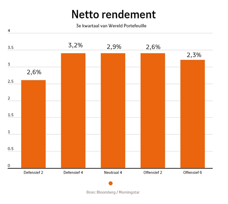 De goudprijs behaalde een recordhoogte. Hiervan profiteerden de modelportefeuilles. In het derde kwartaal behaalden alle modelportefeuilles weer een positief resultaat. Het rendement van modelportefeuille Neutraal 4 kwam het afgelopen kwartaal uit op 2,9%. Deze portefeuille heeft een standaardweging van 50% obligaties en 50% aandelen.