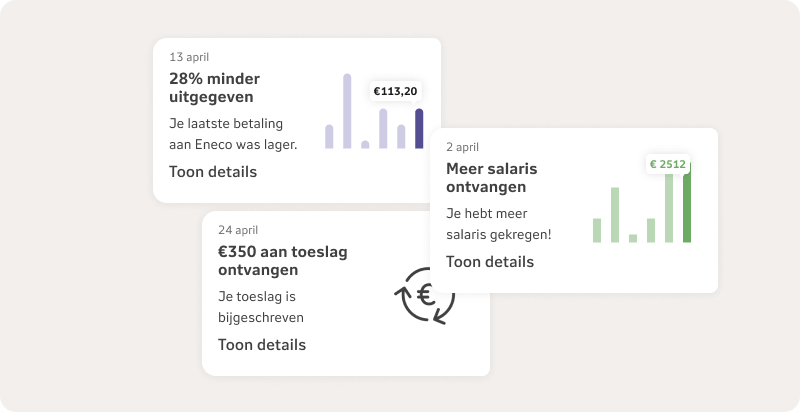 Met NN Inzicht krijg je handige seintjes over je budget. Bijvoorbeeld als je meer of juist minder hebt uitgegeven aan boodschappen. Of als er ruimte is om (extra) te sparen. Daarnaast krijg je berichten bij grote uitgaven en inkomsten. Zo weet je precies hoe je er financieel voorstaat.