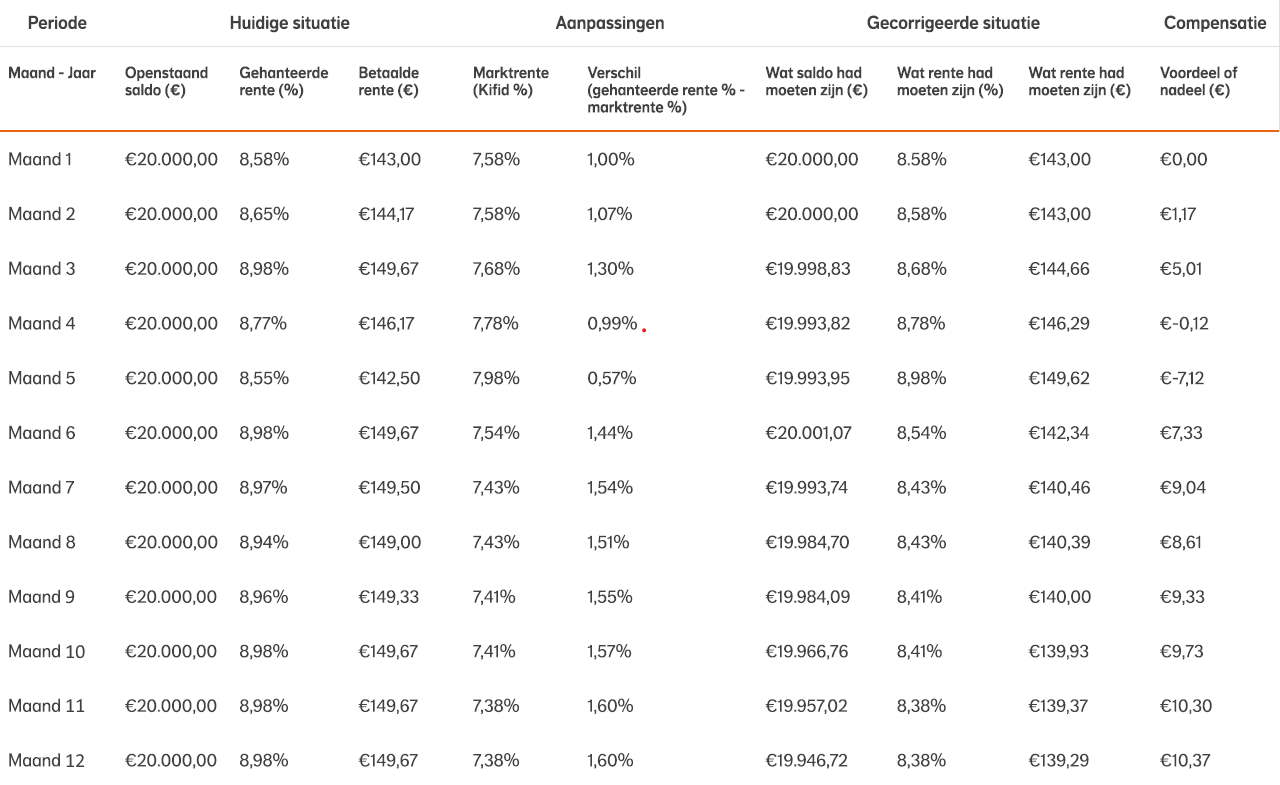 kredietlimiet of 0 als berekeningsbedrag genomen. We hebben bekeken of er over de berekeningsperiode te veel of te weinig is betaald. Als er te veel betaald is, hebben we de limiet als berekeningsbedrag genomen. Is er te weinig betaald, dan zijn we uitgegaan van 0. | Betaalde rente % : Dit is het betaalde rentepercentage van die maand. Deze rente kan anders zijn dan die op je contract staat. Dat komt omdat we voor de berekening de nominale rente gebruiken. Dat rentepercentage is anders dan de effectieve rente die op je contract staat. Effectieve rente is namelijk op jaarbasis berekend en voor de compensatieberekening wordt er op maandbasis gerekend. Hiervoor gebruiken we de nominale rente. Betaalde rente (€) Dit is de rente die je die maand hebt betaald. | Marktrente (Kifid %): We vergelijken de gebruikte rente met de marktrente van diezelfde maand. | Verschil (gehanteerde rente % - marktrente %) Dit is het verschil in rente tussen de betaalde rente en de marktrente. Als dit afwijkt van het verschil tussen de marktrente en de contractrente bij aanvang (zie gegevens van de berekening'), heb je te veel of weinig betaald. Dit noemen we ook wel de delta. | Wat saldo had moeten zijn (€) Dit is het saldo dat je die maand had gehad als je wel de juiste rente had betaald. | Wat rente had moeten zijn (%):Dit is het juiste rentepercentage dat je die maand had moeten betalen. Wat rente had moeten zijn (€) Dit is het bedrag aan rente dat je had moeten betalen als je de juiste rente had betaald over het gecorrigeerde saldo.Voor- of nadeel (€) Dit is het bedrag aan rente dat je die maand te veel of te weinig hebt betaald.