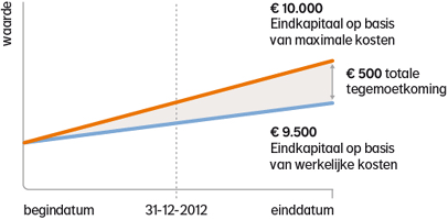 Je hebt recht op een tegemoetkoming als het eindkapitaal met de werkelijke kosten lager is dan het eindkapitaal met de maximale kosten.