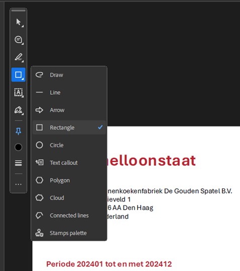 Open je verzamelloonstaat in Adobe Reader en selecteer de vorm ‘rechthoek’.