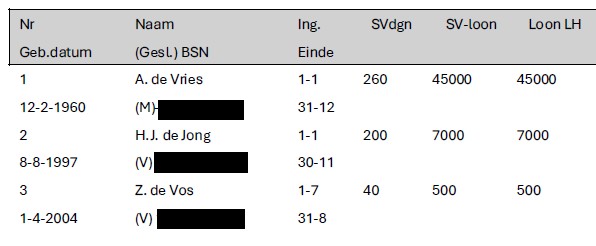 Sleep de rechthoek alleen over de BSN’s van je werknemers, zodat deze niet meer zichtbaar zijn. In dit voorbeeld zijn ook de namen zwart gemaakt. Je hoeft alleen de BSN’s onleesbaar te maken.