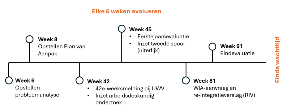 Hierin bespreek je samen met je werknemer en de bedrijfsarts de voortgang van de re-integratie. Dit is ook de uiterlijke startdatum voor een tweede spoortraject. Dit traject start als een langdurig zieke werknemer niet kan terugkeren binnen de eigen organisatie. Je kijkt dan samen naar mogelijkheden om te re-integreren bij een andere werkgever.