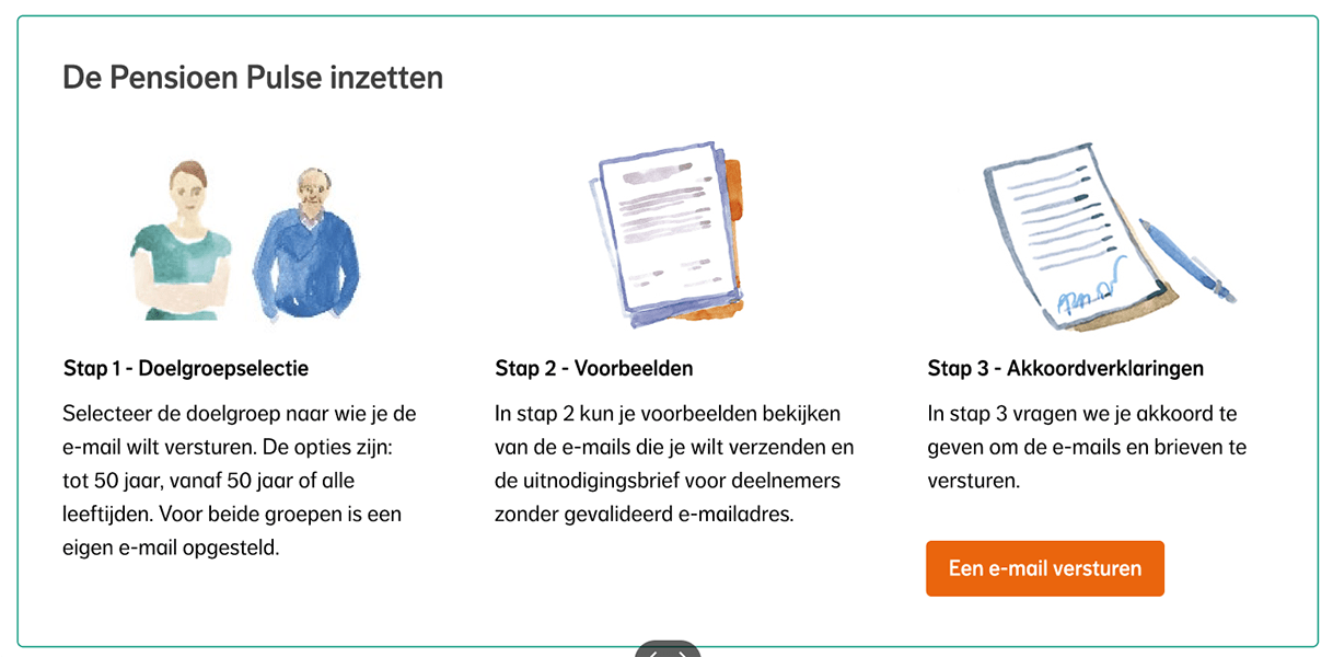 De HCP biedt ook handvatten en tools voor pensioencommunicatie. Dat onderdeel heet de Pensioen Pulse. Je vindt hier tools zoals activatiemails. Daarmee kun je jouw werknemers aansporen om zich (beter) te verdiepen in hun pensioen. Of om hun risicoprofiel in te vullen. Maar je kunt ze hiermee bijvoorbeeld ook informeren over de gevolgen van het pensioenakkoord.